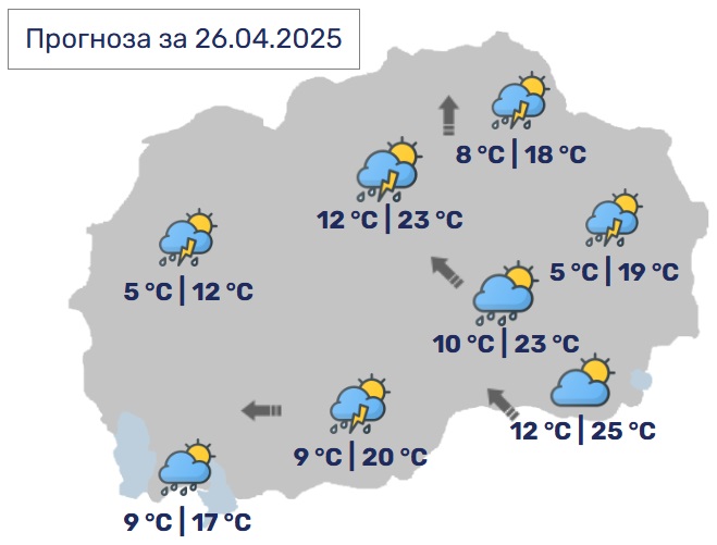 Утре времето ќе биде променливо облачно и нестабилно со повремени локални врнежи од дожд и грмежи. Наместа процесите ќе бидат поинтензивни во форма на невреме со пообилен пороен дожд, силен ветер и услови за изолирана појава на град. Минималната температура ќе се движи до 4 до 10, а максималната од 15 до 23 Целзиусови степени.