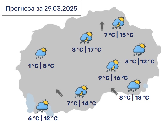 Утре времето ќе биде променливо облачно и нестабилно со повремени врнежи од дожд, особено во попладневните часови. Локално ќе има услови за појава на краткотрајно невреме со пообилен пороен дожд, појава на грмежи и засилен ветер. Минималната температура ќе се движи од 3 до 8, а максималната од 12 до 19 Целзиусови степени.