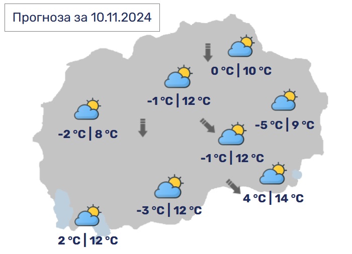 Утре времето ќе биде облачно со сончеви периоди. Наместа ќе има услови за повремен слаб дожд. Ќе дува слаб до умерен ветер од северен правец. Утринските температури ќе се движат од -5 до 5, а дневните од 8 до 14 Целзиусови степени.