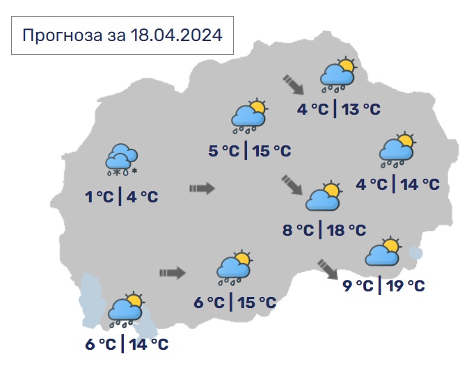 Во Скопје променливо облачно и посвежо со услови за повремен дожд. Ќе дува слаб до умерен северозападен ветер. Минималната температура ќе се спушти до 6, а максималната ќе достигне до 15 степени.