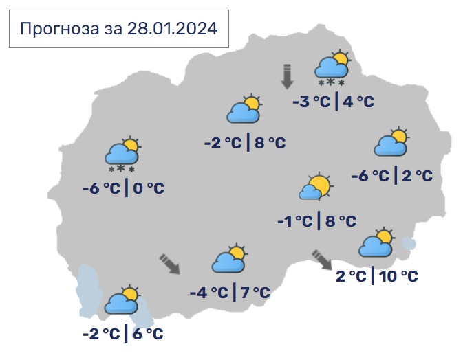 Дневните температури ќе се движат од 0 до 10 Целзиусови степени.