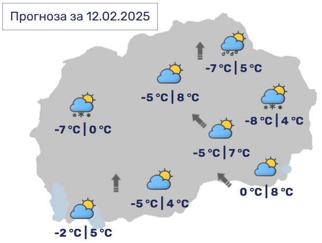 Во Скопје, утрото ќе биде студено, во текот на денот променливо облачно со кратки сончеви периоди. Ќе дува слаб до умерен ветер од југоисточен правец. Минималната температура ќе се спушти до -5, а максималната ќе достигне до 8 Целзиуови степени.