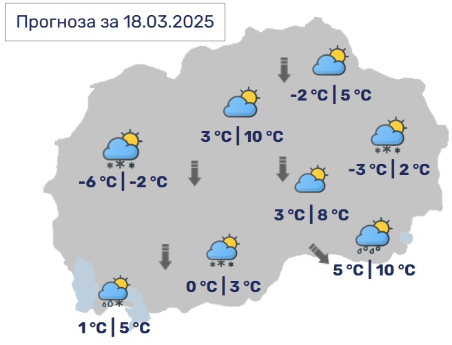 Во Скопје, променливо облачно со умерен до засилен северен ветер. Претпладне во делови од котлината ќе има услови за провејување на слаб снег.