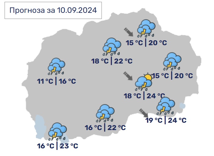 Дневните температури ќе се движат од 16 до 27 Целзиусови степени.