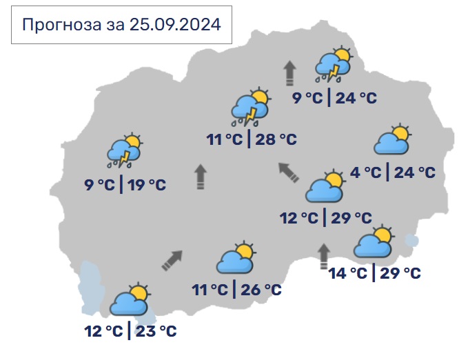 Во Скопје времето ќе биде променливо облачно, попладне во делови од котлината ќе има услови за краткотраен пороен дожд и грмежи. Минималната температура ќе се спушти до 11, а максималната ќе достигне до 28 степени.