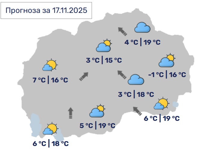 Во Скопје, наутро во делови од котлината ќе има услови за појава на слаба магла. Во текот на денот времето ќе биде претежно облачно. Ќе дува умерен до засилен јужен ветер.