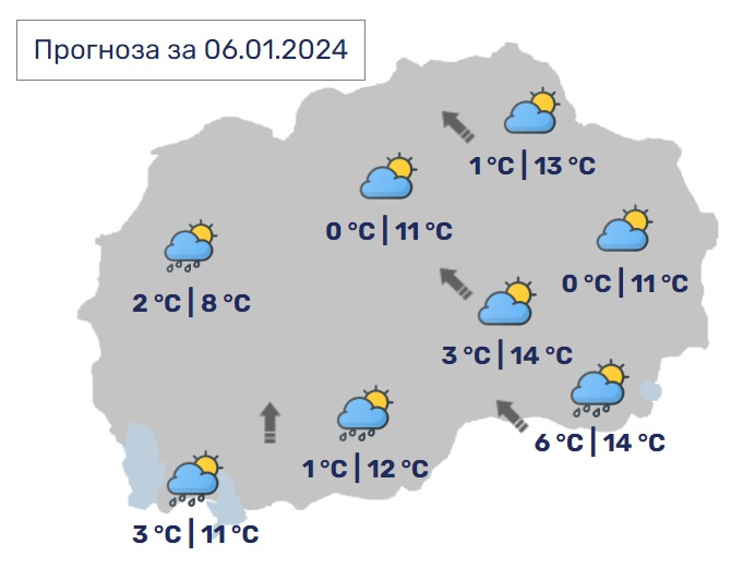 Дневните температури ќе се движат од 2 до 12 Целзиусови степени.