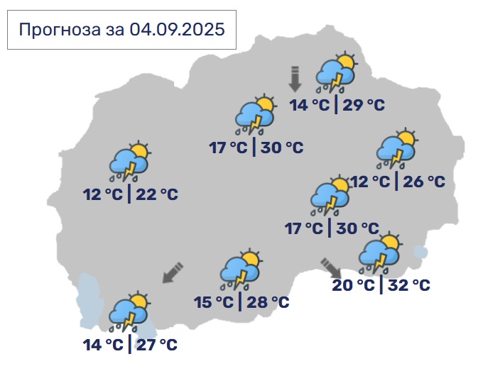 Во Скопје, променливо облачно и нестабилно со пороен дожд и грмежи, во делови од котлината во форма на краткотрајно невреме. Во текот на денот ќе дува слаб до умерен северен ветер.