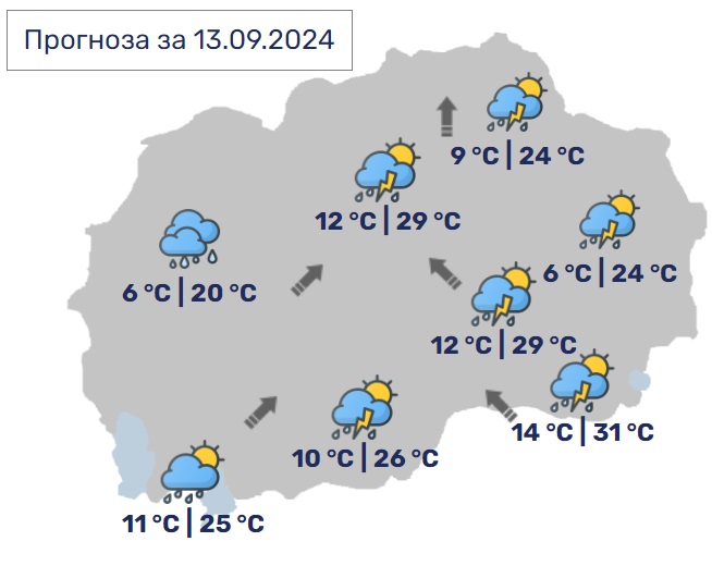 Дневните температури ќе се движат од 11 до 26 Целзиусови степени.
