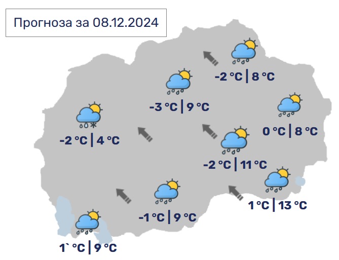 Дневните температури ќе се движат од 5 до 14 Целзиусови степени.