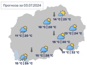 Минималната температура ќе биде во интервал од 13 до 20, а максималната ќе достигне од 24 до 32 Целзиусови степени.