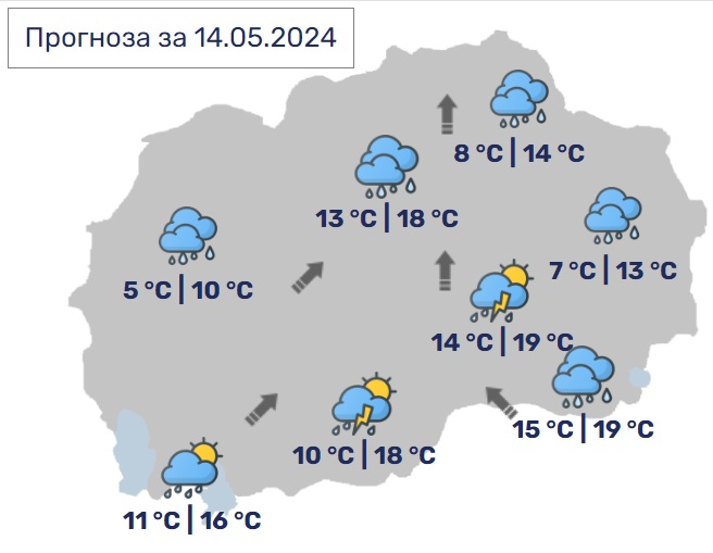 Во Скопје времето ќе биде претежно облачно со повремени врнежи од дожд, особено попладне кога во делови од котлината ќе бидат поројни. Ќе дува слаб до умерен ветер од јужен правец. Минималната температура ќе се спушти до 13, а максималната ќе достигне до 18 степени.