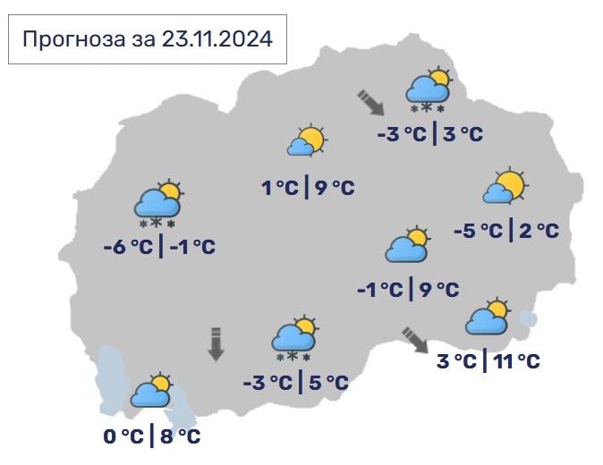 Утре наутро ќе биде ведро и многу студено, преку денот сончево со мала локална облачност. Ќе дува слаб ветер претежно од северозападен правец.