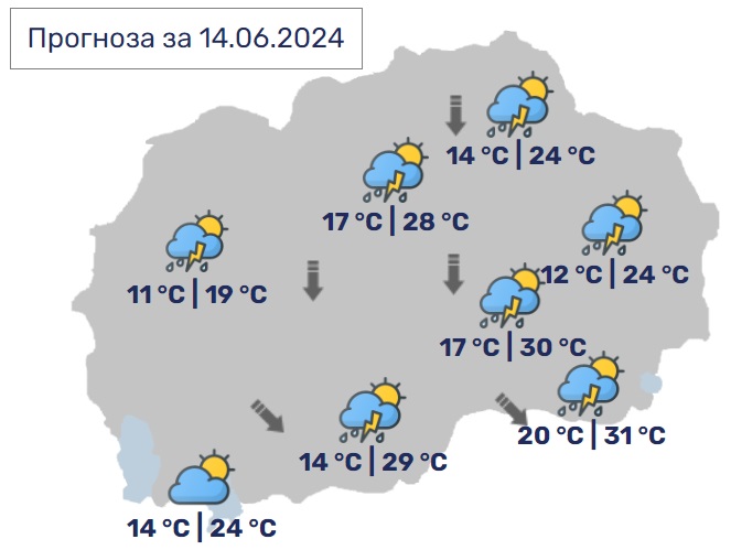 Во Скопје променливо облачно, претпладне со повремен пороен дожд и грмежи. Ќе дува умерен, а во делови од котлината повремено засилен северен ветер. Попладне облачноста ќе се намали и ќе преовладува ведро време.