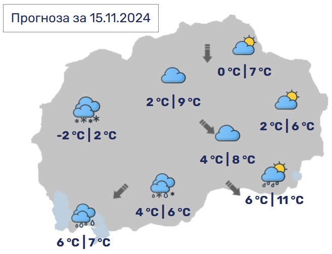 Утре претпладне времето ќе биде променливо облачно со сончеви периоди. Попладне облачноста ќе се намали. Ќе дува слаб, долж Повардарието умерен ветер од северозападен правец. Минималната температура ќе се движи од -5 до 3, а дневната од 7 до 12 Целзиусови степени.