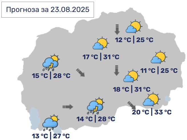 Во Скопје, променливо облачно со сончеви периоди. Ќе дува умерен, повремено засилен северен ветер. Минималната температура ќе се спушти до 17, а максималната ќе достигне до 31 степен.