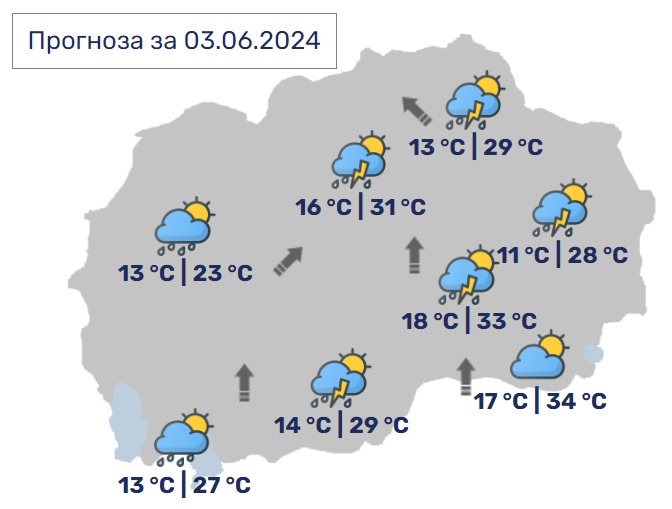 Во Скопје променливо облачно со слаб до умерен ветер од јужен правец. Во делови од котлината ќе биде нестабилно со пороен дожд, грмежи и засилен ветер.