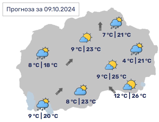 Утре наутро по одделни котлини ќе има услови за појава на слаба магла или ниска облачност. Преку денот сончево и топло со мала до умерена локална облачност. Ќе дува слаб до умерен ветер од јужен правец.