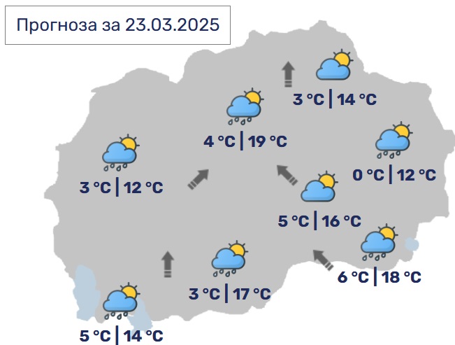 Утре времето ќе биде променливо облачно наместа со повремен дожд. Ќе дува умерен до засилен јужен ветер. Минималната температура ќе се движи од 4 до 10, а максималната од 14 до 20 Целзиусови степени.