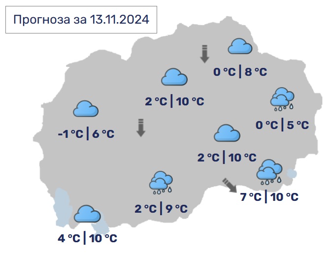 Утре времето ќе биде претежно облачно со повремени врнежи од дожд, наместа пообилни (над 20 л/м2), а на планините со повремен снег. Ќе дува слаб до умерен, долж Повардарието повремено засилен ветер од северен правец. Минималната температура ќе се движи од 1 до 8, а максималната од 5 до 11 Целзиусови степени.