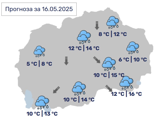 Утре времето ќе биде променливо облачно со повремени локални врнежи од дожд. На повисоките планини во утринските часови ќе има услови за слаб снег. Ќе дува слаб до умерен, а долж Повардарието повремено засилен ветер од северозападен правец. Максималната температура ќе се движи од 12 до 21 Целзиусов степен.