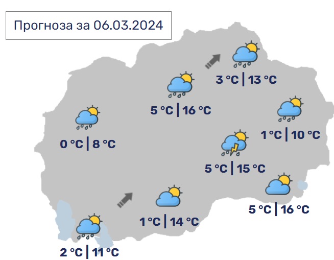 Во Скопје променливо облачно, попладне во делови од котлината со повремен дожд. Ќе дува слаб до умерен ветер од југозападен правец. Минималната температура ќе се спушти до 5, а максималната ќе достигне 16 степени.