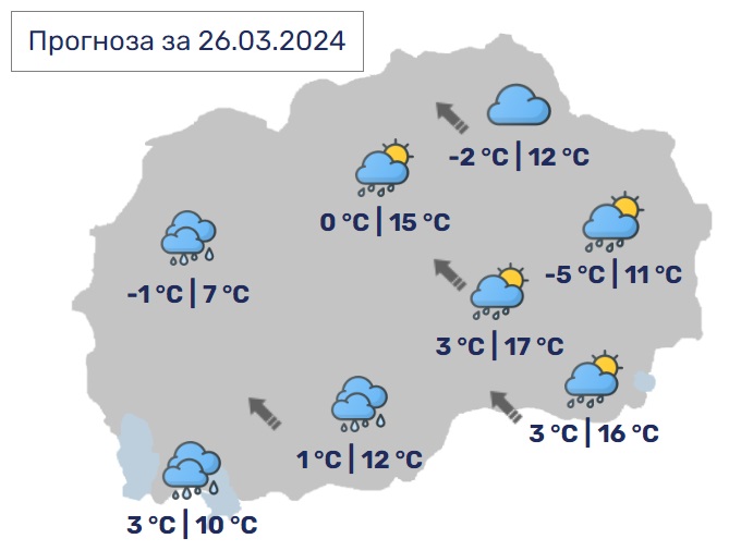 Утре времето ќе биде променливо облачно со сончеви периоди и со умерен до засилен ветер од југоисточен правец, особено долж Повардарието. Кон крајот на денот и во текот на ноќта во западните делови ќе има врнежи од дожд, наместа поројни и проследени со ретки грмежи.