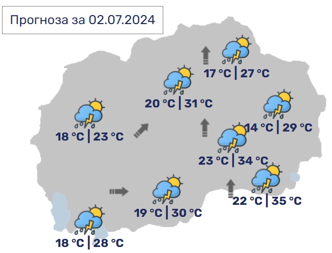 Во Скопје ќе биде променливо облачно со повремен пороен дожд и грмежи, во делови од котлината во форма на невреме со интезивен пороен дожд, силен ветер од над 70 километри на час и град. Услови за краткотраен пороен дожд, грмежи и засилен ветер ќе има и во раните утрински часови. Минималната температура ќе се спушти до 20, а максималната ќе достигне до 31 Целзиусов степен