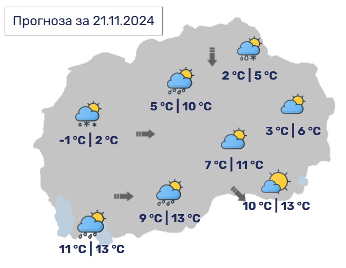 Утре времето ќе биде променливо облачно, попладне и во текот на ноќта со повремени врнежи од дожд, наместа пообилни (над 30л/м2). Преку денот ќе дува засилен ветер од јужен правец, кој во текот на ноќта ќе го промени правецот во северен, (наместа над 70 km/h), а врнежите од дожд ќе преминат во снег и на некои пониски места.