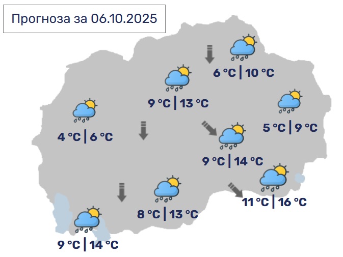 Во Скопје ќе биде променливо облачно со повремен локален дожд. Ќе дува умерен, во делови од котлината повремено засилен ветер од северен правец. Минималната температура ќе се спушти до 9, а максималната ќе достигне 13 степени.