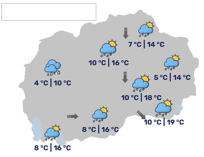 Во Скопје, променливо облачно со повремен дожд. Ќе дува слаб до умерен ветер од северен правец. Минималната температура ќе се спушти до 10, а максималната ќе достигне до 16 степени.
