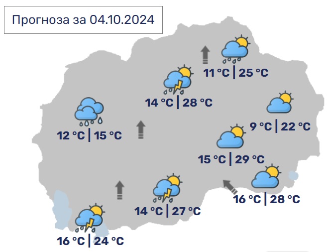 Во Скопје променливо облачно, попладне и кон крајот на денот со повремени врнежи од дожд. Во делови од котлината врнежите ќе бидат пообилни, проследени со грмежи и засилен ветер. Минималната температура ќе се спушти до 14, а максималната ќе достигне до 28 степени.