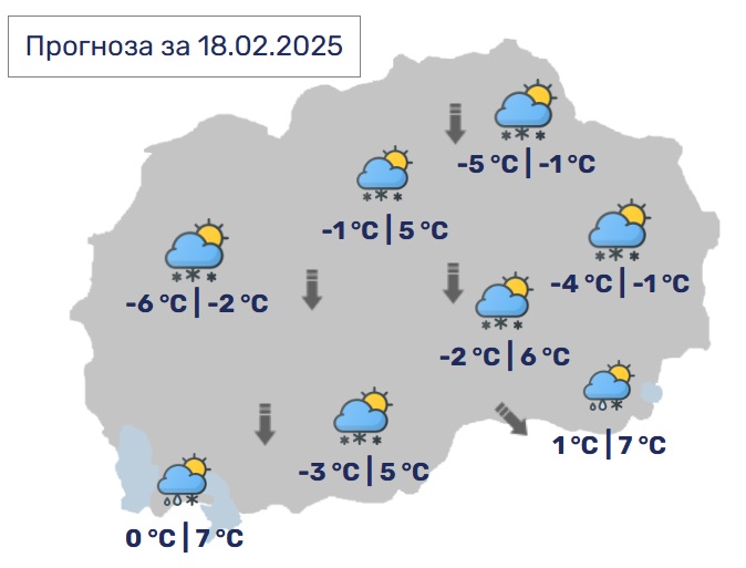 Утре наутро ќе биде ведро и студено, а преку денот сончево со умерена облачност и со умерен до засилен северен ветер. Минималните температури ќе се движат од -8 до 0, а максималните од -2 до 6 Целзиусови степени.