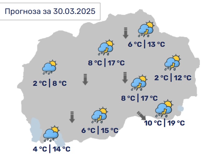 Утре времето во Македонија ќе биде променливо облачно и нестабилно со повремени врнежи од дожд, особено во попладневните часови. Локално ќе има услови за појава на краткотрајно невреме со пообилен пороен дожд (за кратко време над 15 л/м2), грмежи и засилен ветер. Дневните температури ќе се движат од 10 до 17 Целзиусови степени, а минималните утрински од 2 до 9 степени.