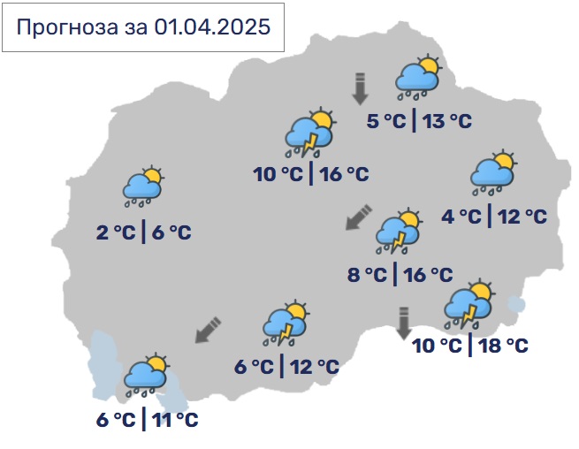 Утре времето ќе биде променливо облачно и нестабилно со повремени врнежи од дожд, особено во попладневните часови. Локално ќе има услови за појава на краткотрајно невреме со пообилен пороен дожд, грмежи и засилен ветер. Минималната температура ќе се движи од 5 до 10, а максималната од 12 до 19 Целзиусови степени.