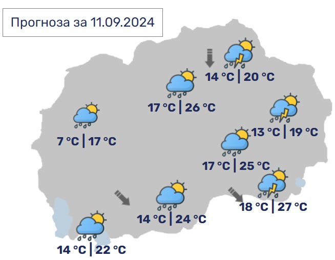 Во Скопје променливо облачно, претпладне со повремен дожд, а попладне со сончеви периоди. Ќе дува умерен, повремено засилен ветер од северен правец.