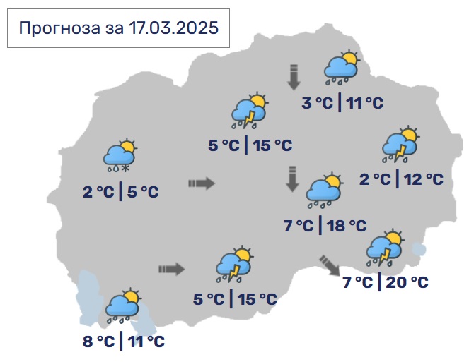 Утре времето ќе биде променливо облачно и студено, претпладне со повремени врнежи од дожд, на планините и на повисоките места од снег. Ќе дува умерен, наместа повремено засилен ветер од северен правец. Попладне облачноста ќе се намали. Минималната температура ќе се движи од -3 до 5, а максималната од 2 до 10 Целзиусови степени.