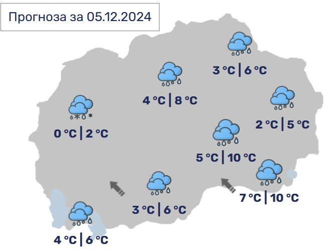 Утре времето ќе биде променливо облачно, во утринските часови со слаб локален дожд. Кон крајот на денот и во текот на ноќта на повеќе места ќе има повремени врнежи од дожд. Ќе дува слаб до умерен ветер од јужен правец, поизразен долж Повардарието. Дневните температури ќе се движат од 4 до 12 Целзиусови степени.