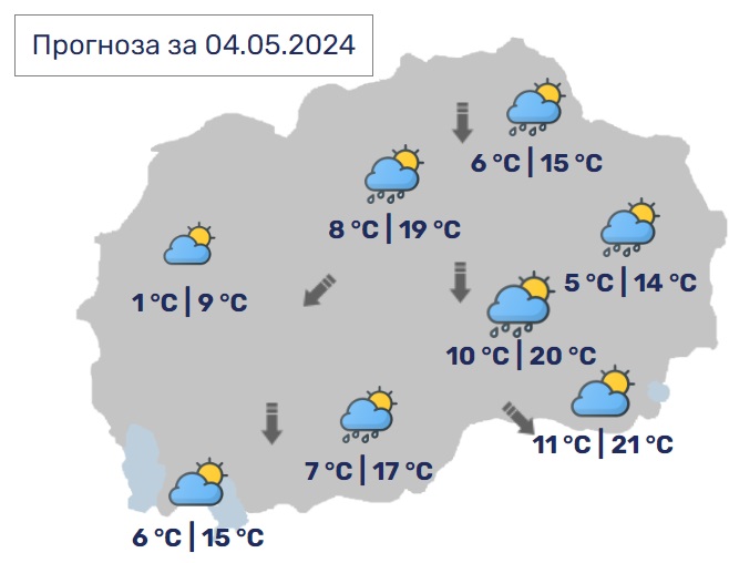 Во Скопје променливо облачно со повремени врнежи од дожд. Ќе дува умерен ветер од северен правец.