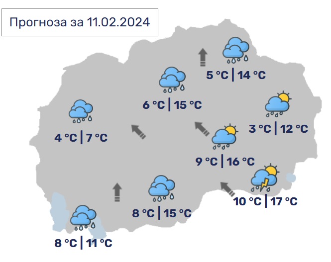 Дневните температури ќе се движат од 5 до 15 Целзиусови степени.