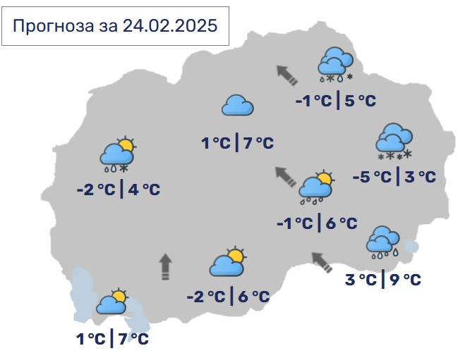Во Скопје претежно облачно, во раните утрински часови во делови од котлината ќе има услови за врнежи од слаб дожд и снег. Ќе дува слаб до умерен ветер од југоисточен правец.