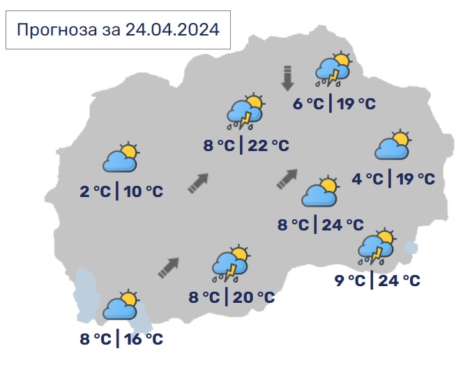 Во Скопје променливо облачно и потопло со сончеви периоди. Во делови од котлината ќе има услови за појава на краткотраен пороен дожд со ретки грмежи. Ќе дува слаб до умерен променлив ветер. Минималната температура ќе се спушти до 6, а максималната ќе достигне до 22 степена.