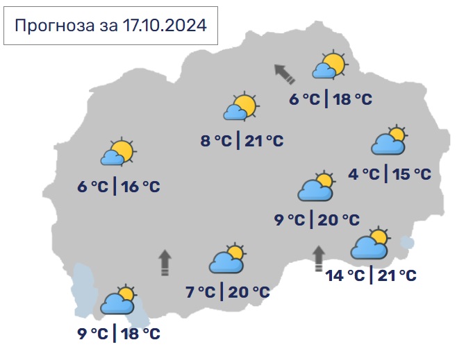 Утре времето во Македонија ќе биде променливо облачно со сончеви периоди. Претежно во западните делови ќе има слаби врнежи од дожд. Ќе дува слаб до умерен ветер од јужен правец. Дневните температури ќе се движат од 14 до 20 Целзиусови степени.