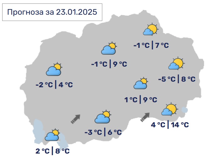 Дневните температури ќе се движат од 4 до 15 Целзиусови степени.