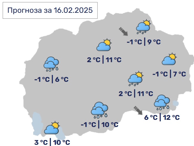 Утре времето ќе биде променливо облачно со повремени врнежи, на планините и на некои повисоки места од снег, а во пониските од дожд и услови врнежите повремено да преминуваат во снег. Ќе дува слаб до умерен, наместа долж Повардарието повремено засилен ветер од северен правец. Минималните температури ќе се движат од -1 до 6, а максималните од 2 до 8 Целзиусови степени.