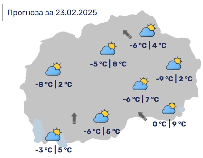 Утре времето ќе биде умерено до значително облачно, попладне и кон крајот на денот ќе има услови за слаб дожд, на планините и на повисоките места слаб снег. Ќе дува слаб до умерен ветер од југоисточен правец. Минималната температура ќе се движи од -8 до 1, а максималната од 3 до 9 Целзиуспви степени.