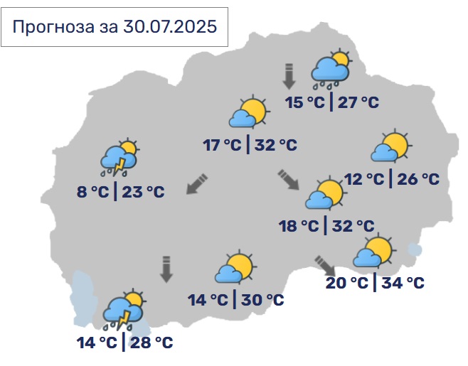 Утре времето ќе биде променливо облачно, посвежо и нестабилно со локален пороен дожд, грмежи и услови за краткотрајно невреме. Ќе дува слаб до умерен ветер од северен правец. Дневните температури ќе достигнат до 32 Целзиусови степени.