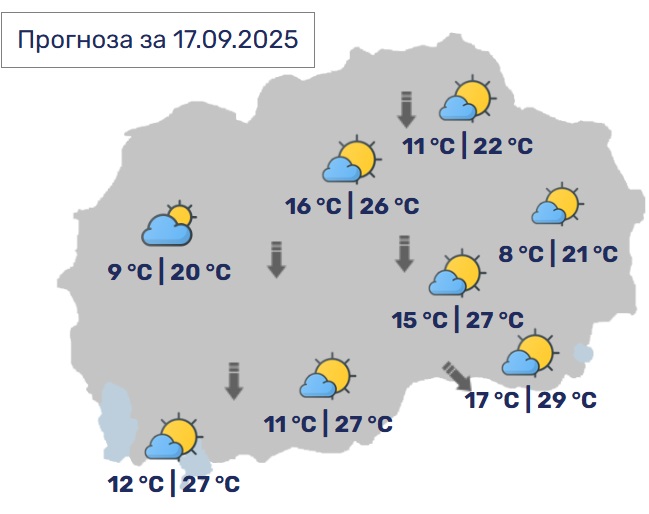 Утре утрото ќе биде посвежо, преку денот сончево со дневни температури до 28 Целзиусови степени. Ќе дува слаб до умерен, наместа долж Повардарието повремено засилен северен ветер (над 60 km/h).