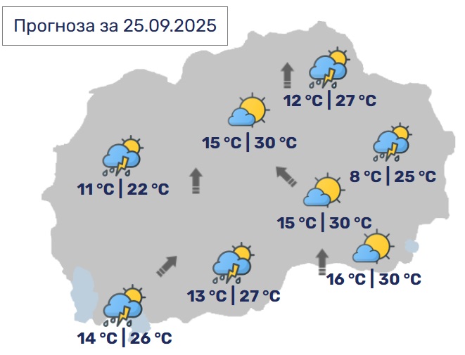 Утре времето ќе биде променливо облачно, посвежо и нестабилно со локален пороен дожд и грмежи и дневни температури до 24 Целзиусови степени. Наместа врнежите ќе бидат пообилни (над 20 l/m²). Ќе дува умерен до засилен ветер од југоисточен правец.