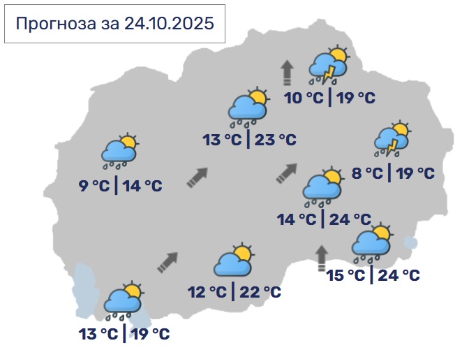 Во Скопје ќе биде променливо облачно, претпладне со повремен дожд, а локално пороен. Ќе дува умерен ветер од југозападен правец. Минималната температура 13 степени, а максималната ќе достигне до 23 степени.